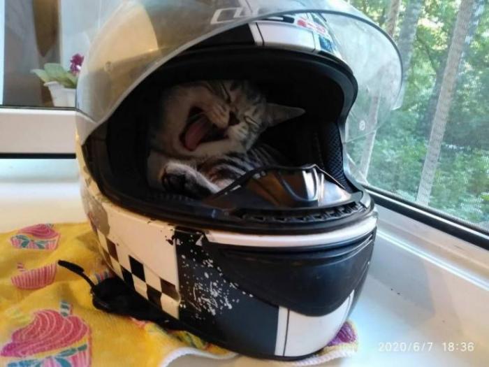パパのヘルメットに入ってたら眠くなってきて、